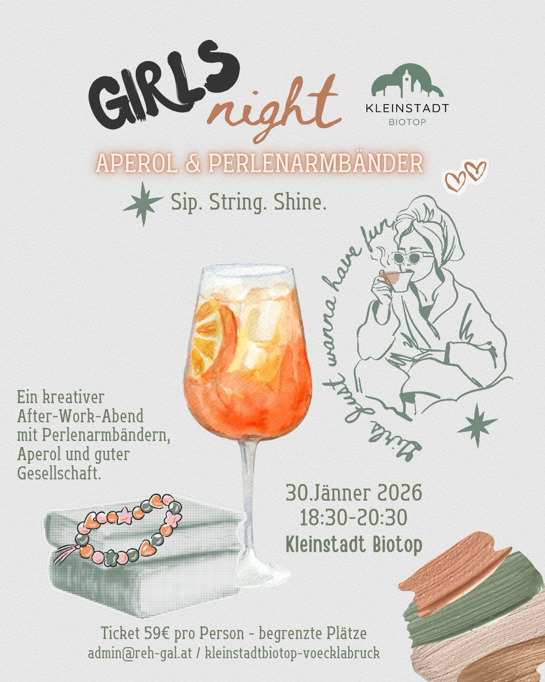 Preisinformation € 59,- pro Person Im Preis inkludiert: – eine große Auswahl an wunderschönen Perlen – alles zum Fädeln deiner Armbänder – 1 Aperol (oder alkoholfreie Alternative)
