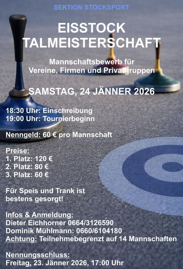 Die Sektion Stocksport lädt zu den Talmeisterschaften am Samstag, 24.01.2026 in die Eisstocksportanlage in Außervillgraten ein.
