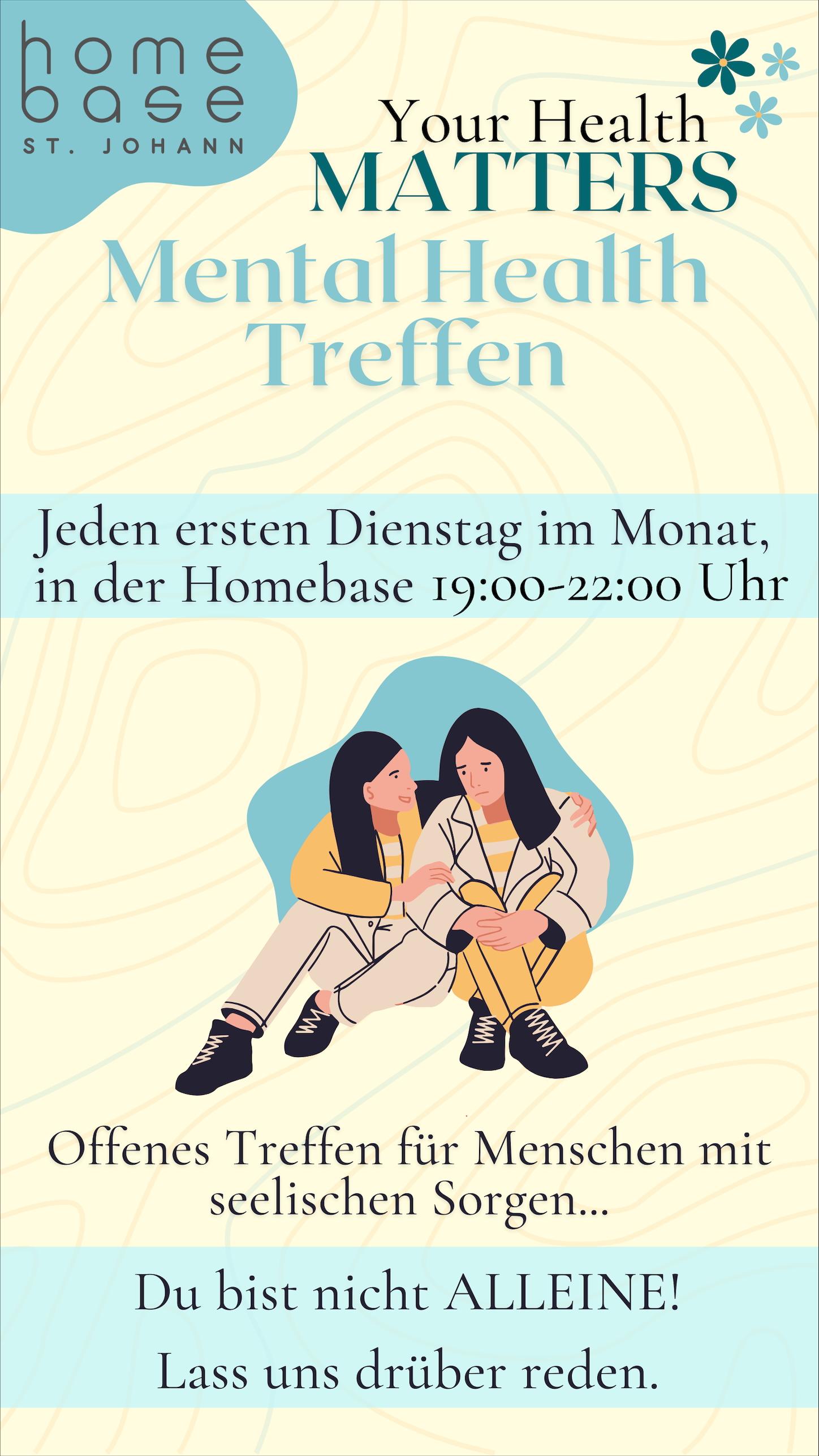Unser Treffen lädt dazu ein, ins Gespräch zu kommen: über mentale Gesundheit, Abschalten, Gelassenheit, innere Ruhe und positives Denken. In einem sicheren und wertschätzenden Rahmen sind sowohl Betroffene als auch Angehörige herzlich willkommen.
