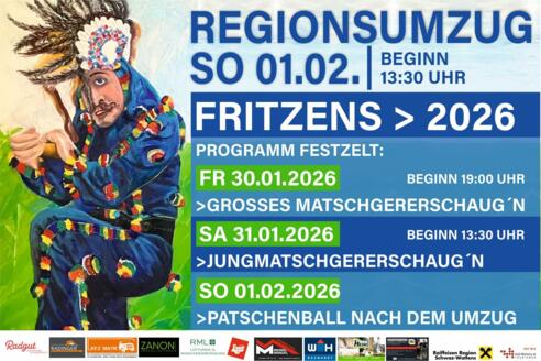 Der Auftakt zum Regionswochenende erfolgt am Freitag, dem 30. Jänner, ab 19:00 Uhr im beheizten Festzelt. Beim großen „Matschgerer- & Mullerschaug’n“ zeigen rund acht Gruppen aus Fritzens und den umliegenden Dörfern ihr Können und begeistern das Publikum mit ihren traditionellen Figuren und Bräuchen. Dieses besondere Ereignis ist längst ein Fixpunkt im Veranstaltungskalender der Region und zieht Jahr für Jahr zahlreiche Besucher an. Rund 1.500 Gäste sorgen für eine unvergleichliche Atmosphäre und feiern gemeinsam den Auftakt zu einem Wochenende voller gelebtem Brauchtum.