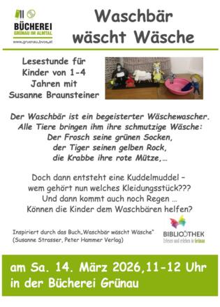 Der Waschbär ist ein begeisterter Wäschewascher. Alle Tiere bringen ihm ihre schmutzige Wäsche: