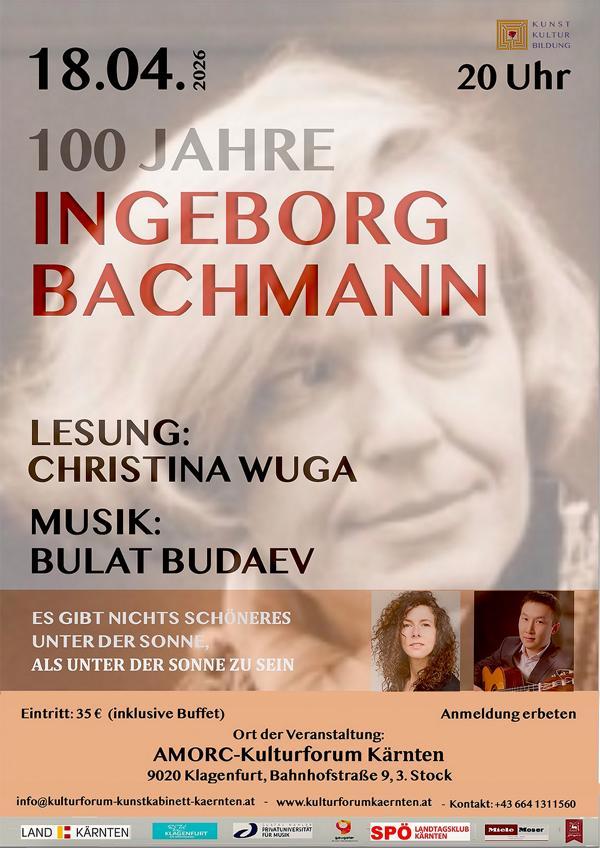 An diesem Abend werden die tiefen, sinnhaften Texte Ingeborg Bachmanns gelesen von der Schauspielerin Christina Wuga, dazu gibt es eine musikalische Umrahmung mit verschiedener Musik vom Gitarristen Bulat Budaev.