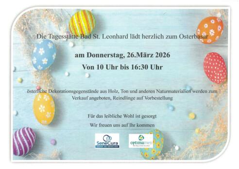 Die Tagesstätte Bad St. Leonhard lädt herzlich zum Osterbasar am Donnerstag, 26. März 2026 von 10 bis 16.30 Uhr ein.