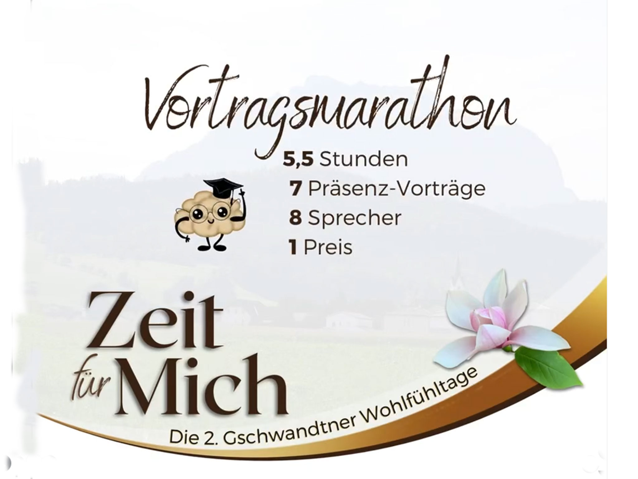 Ein besonderes Highlight erwartet dich am Samstag: ein Vortragsmarathon mit 7 inspirierenden Vorträgen von 15:30 bis 21:00 Uhr. Die Vortragenden nehmen dich mit auf eine spannende Reise durch verschiedene Themenbereiche rund um körperliches, mentales und emotionales Wohlbefinden.