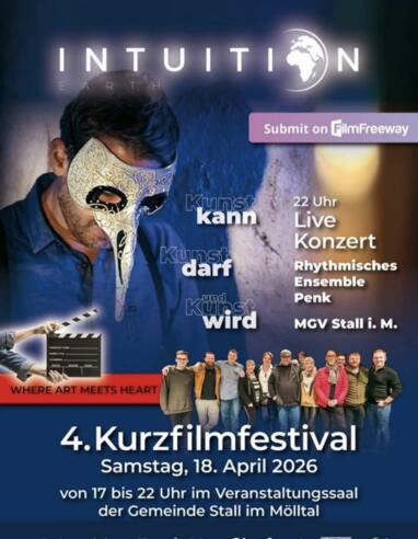 Das mittlerweile 4. „Intuition“ Kurzfilmfestival geht am Samstag, 18. April im Veranstaltungssaal der Gemeinde Stall über die Bühne. Von 17:30 Uhr bis 22:00 Uhr werden heimische und Internationale Kurzfilme gezeigt und von einer Jury bewertet. Darunter sind Harald König Martin Schinagl Igor Pucker Christian Rieder Beate Himmelstoß und Mansur Sarsembayev. Die Moderation übernimmt Martin Schinagl. Nach den Filmen, ab 22 Uhr gibt es ein Live-Konzert mit dem „Rhythmischen Ensemble Penk“ (REP).