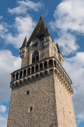 Der Haslacher Kirchturm ist ein imposantes Bauwerk. Das freistehende Gebäude war einst Teil der Wehranlage und wurde erst später zum Kirchturm umfunktioniert. Hinter seinen massiven Mauern befinden sich auf acht Stockwerken stimmungsvolle Räume mit besonderer Atmosphäre, die von Rückzug und Abwehr erzählen, die aber auch Ruhe und Kontemplation verbreiten. Von der obersten Etage aus kann man eine Außengalerie betreten, von der man einen beeindruckenden Rundumblick über Haslach und die gesamte Umgebung hat.