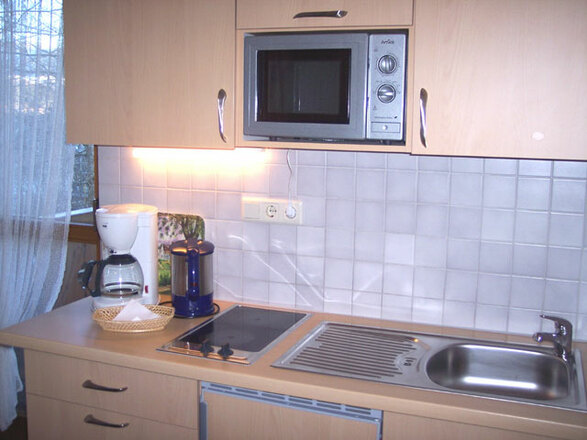 - Komplett inventarisierte Kleinküche mit Spüle, Kühlschrank, Kaffeemaschine und Wasserkocher