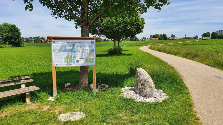 An der nächsten Kreuzung fahren wir weiter geradeaus, biegen danach die erste Straße links ab in die Flinsbachstraße, wo die nächste Station wartet. Wir passieren das Holzkirchner Hallenbad "BaTuSa" zurück zur Baumgartenstraße und folgen dieser weiter nach Süden bis zu einer Abzweigung auf eine kleine asphaltierte Straße (aktuell noch nicht als Radweg beschildert). Diese führt uns zur nächsten Station "Geographische Lage".
