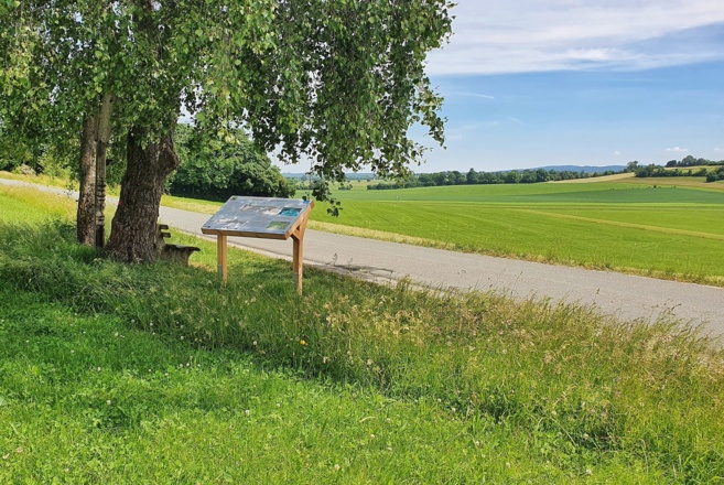 Bis zum Aussichtspunkt bei Station 5 geht es leicht bergauf, ist der Aussichtspunkt erreicht lädt jedoch eine bequeme Bank zur Pause - gleichzeitig befindet sich hier eine weitere Infotafel.