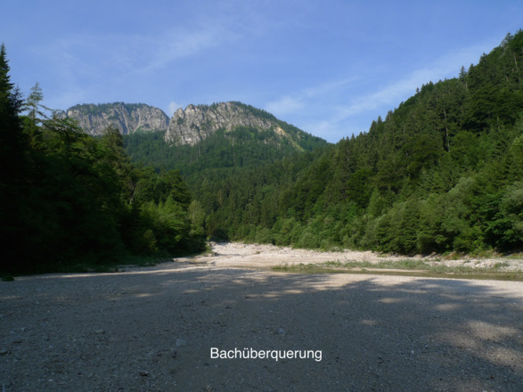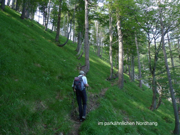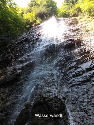 Kurz danach kommen 3 Steinmauern im Bachbett, deren letzte einen kleinen Stausee bildet. Hier sehen wir am gegenüberliegenden Ufer ein steiles mit Geröll gefülltes, ausgetrocknetes Bachbett und darin ca. 100 m über uns einen auffallenden nahezu quaderförmigen Felsen. Dieser ist unser erstes Ziel. Oberhalb des Wasserstaus überschreiten wir den meist flachen Bach ohne Brücke und finden am gegenüberliegenden Ufer einen gut ausgetretenen, aber nicht markierten Pfad, der uns in Aufstiegsrichtung am rechten Rand des ausgetrockneten Bachbettes bis über den quaderförmigen Felsen hinaufführt. Kurz oberhalb überschreiten wir das Bachbett. Im schattigen Wald steigen wir weiter, kommen an einem kleinen Wasserfall, dem Wasserwandl vorbei. Das Gelände wird steiler. Der Baumbestand wird schnell lichter, so dass der Hang einen parkähnlichen Eindruck macht. Die Vegetation ist vielfältig. Nach knapp 2 Std. teilt sich der Weg kurz unter einem Grat. Wir steigen teilweise ausgesetzt in wenigen Minuten nach rechts zum exponiert wirkenden Rötlwandkopf (1379 m) hinauf, wo wir uns die erste Rast verdient haben.