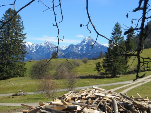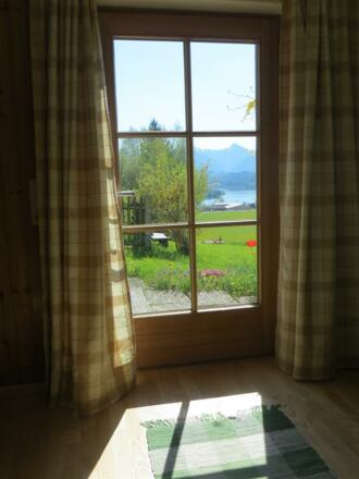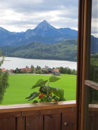 Malerischer Blick auf den Weißensee und auf die Allgäuer Berge von jeder der drei Ferienwohnungen auf unserem Hof Hinteregg. Umgeben von Wiesen oberhalb des Weißensees, 10 Gehminuten zum See, 10 km bis Schloss NeuschwansteinSonstigesParkplatz, Sonnenliegen, Geschirr- und Handtücher, Gitterbett und Kinderhochstuhl inklusive, Unterstellplatz für Fahrräder, WLAN