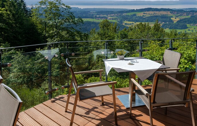 Die Aussicht von unserer neuerrichteten sonnigen „Terrasse Chiemseeblick“ über weite Teile des Chiemgaus hinaus bis hin zum Chiemsee, unserem bayerischen Meer, gleicht einer Traumkulisse.