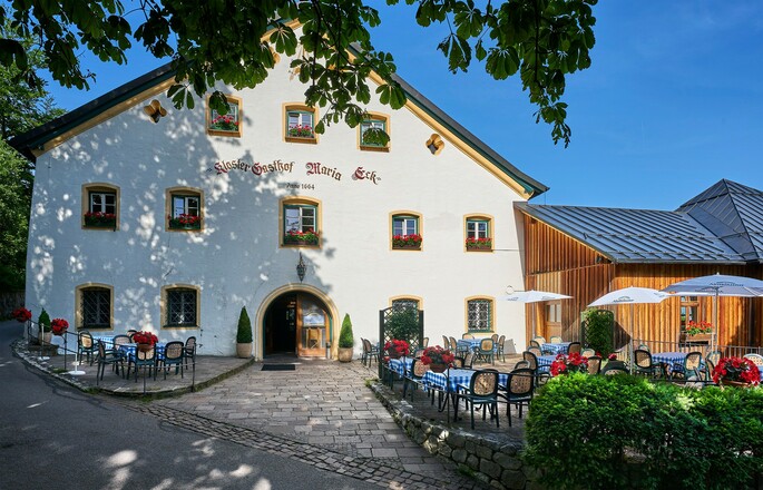 Mitten im Chiemgau, hoch über den Dächern der uns zu Füßen liegenden Gemeinden Bergen und Siegsdorf befindet sich auf dem früher sogenannten „Egg“, einem vorspringenden Teil des Kirchenhügels, seit Jahrhunderten unser Klostergasthof Maria Eck auf 800 Metern Höhe.