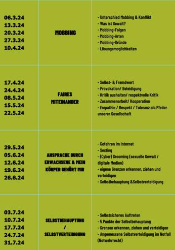 Das Haus der Jugend wird ab 6.3.2024 einen gezielten Fokus auf Gewaltprävention legen und im Rahmen des Programms „Stay Safe“ und „Gemeinsam gegen Gewalt“ den Workshop mit einer sehr erfahrenen Gewaltpräventionsfachtrainerin (EWTO) durchführen. Mag. Nicole Haberacker LLB.oec. BA ist ehemalige Strafrichterin für Jugend- und Sexualstrafrecht und bietet Workshops bzgl. Gewaltprävention, WingTsun (eine chinesische Kampfkunst, die rein der Selbstverteidigung dient) und Anti-Mobbing Workshops an. Im Zusammenschlusses von „Gemeinsam gegen Gewalt“ wird das Ziel verfolgt, Kinder und Jugendliche die notwendigen Fähigkeiten zu vermitteln, um Konflikte friedlich zu lösen, Empathie zu fördern und eine Kultur des Respekts zu etablieren. Die Inhalte des Gewaltpräventionsprogramms von „Gemeinsam gegen Gewalt“ sind die Module MOBBING, FAIRES MITEINANDER, MEIN KÖRPER GEHÖRT MIR, ANSPRACHE DURCH ERWACHSENE und SELBSTVERTEIDIGUNG und SELBSTBEHAUPTUNG.