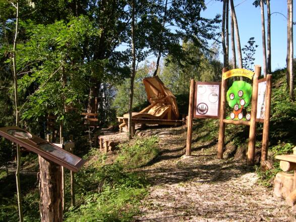 Beim Rückweg macht einen Abstecher zum Baumlehrpfad. Über 30 verschiedene heimische Baumsorten können Ihr hier inklusieve Beschreibung sehen. Mehrere Stationen und ein Rastplatz mit Holzschirmen und Liegen laden zum Verweilen ein.