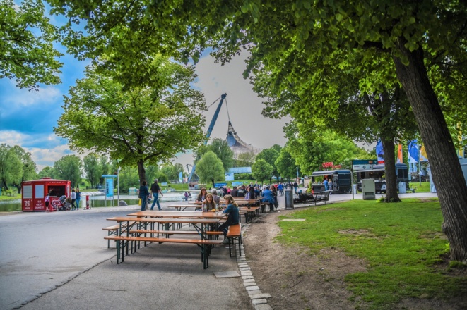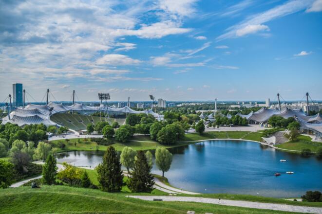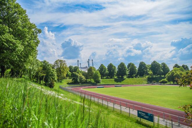 Den Sportplätzen folgend, geht es zu der Grünanlage beim olympischen Dorf. Linksherum geht man entlang der Wohnanlagen, passiert den Erinnerungsort zum Olympia-Attentat von 1972 und gelangt zum modernen Bau der BMW Welt. Von hier geht es über die Brücke auf das Olympiagelände.Ein breiter Weg führt zwischen Olympiaturm und dem olympischen See vorbei zu den Olympiahallen. Sogleich erreicht man das Olympiastadion mit seiner berühmten Dachkonstruktion und quert an seinem Rand über eine Brücke den Olympiasee. Der Rudolf-Harbig-Weg führt rechter Hand zu einem großen freien Gelände, in dessen Mitte sich etwas versteckt die sehenswerte Ost-West-Friedenskirche befindet.Zum Abschluss geht es über kleine Wege auf den Olympiaberg mit fantastischem Blick über die Stadt München. Auf der anderen Seite kommt man über weite Wiesen zur Olympiaalm und hinab zum Olympiasee, bis man an seinem Ende den östlichen Eingang des Parks an der Lerchenauer Straße erreicht und sich gegenseitig für diese sportliche Etappe gratuliert.