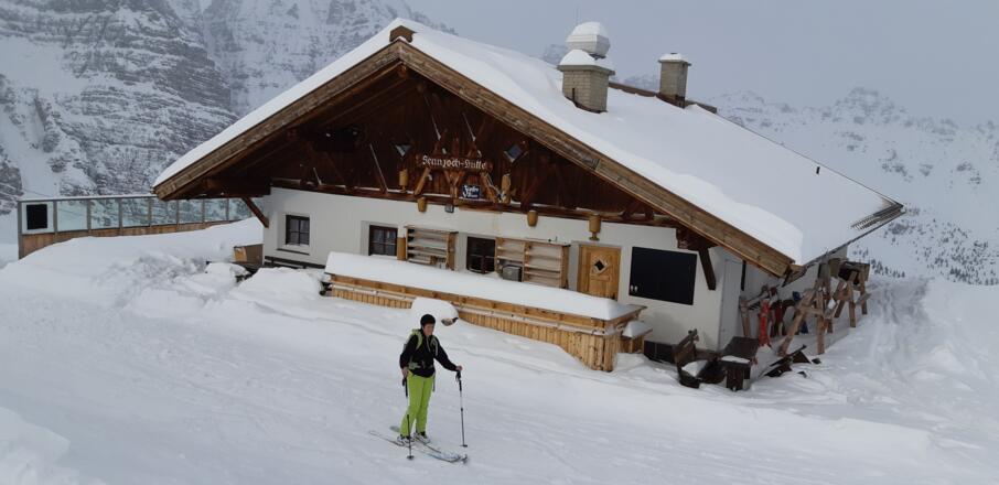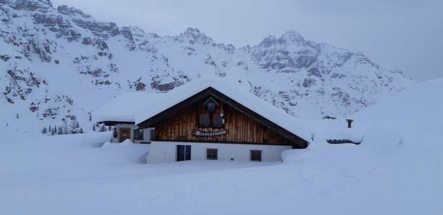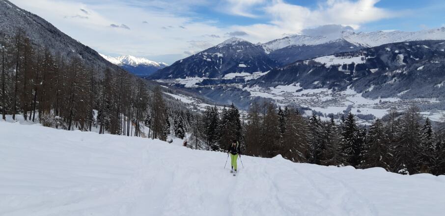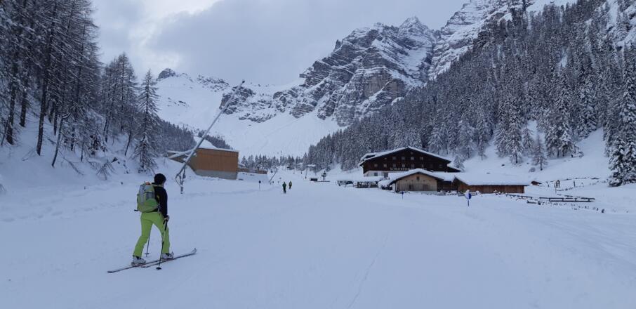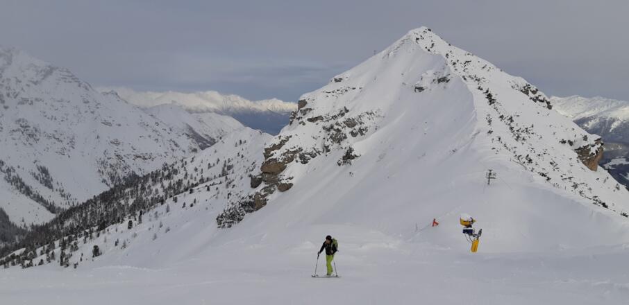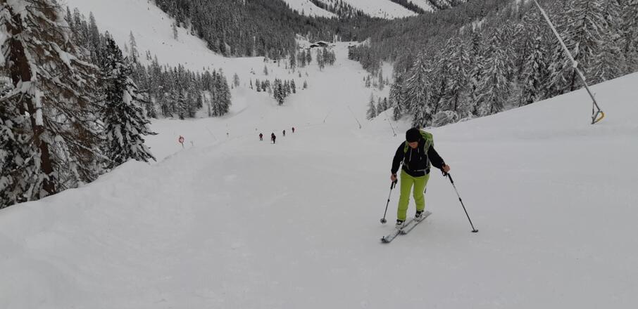 Der erste Abschnitt führt über die schmale Talabfahrt zur Froneben-Alm, es folgt ein Flachstück entlang der Piste zur Schlickeralm, bevor das Gelände steiler wird und wir vorbei an der Zirmachalm zum Sennjoch aufsteigen