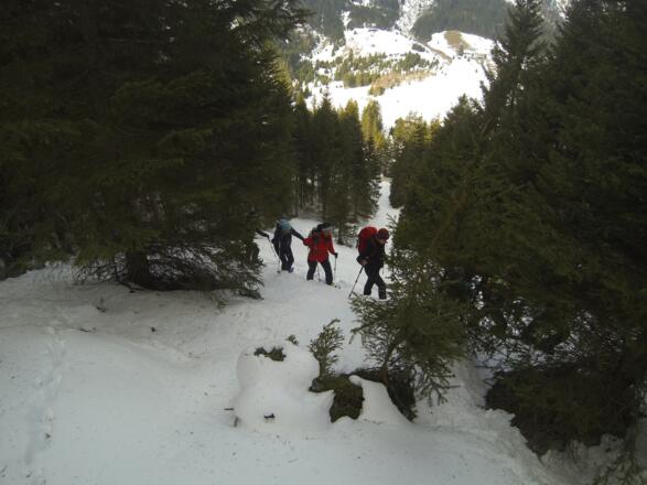 Vom Parkplatz des Gasthof Haneburger folgen wir der Forststraße Richtung Rinseraste. (Wir haben eine Abkürzung steil durch den Wald benützt, nur für gute SchneeschuhgeherInnen) Auf der Forststraße weiter in 3 Kehren zur Großen Lichtung aufsteigen (Höhe 1.600 m) Hier am rechten Waldrand aufsteigen und zum Schluß etwas steiler Richtung Nordosten zur Poversalm.