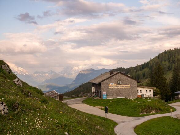 Im weiteren Verlauf fahren wir an der Weißach entlang nach Kreuth. So schön dieses Tal mit seinen Badestellen an der Weißach ist, so stark ist es auch besucht. Ungewöhnlich sanft ansteigend geht es durch die Langenau bergauf und dann wieder entlang der Bayrache bergab. Auf diesem Abschnitt kann sogar ein gewisses Trailfeeling aufkommen, wenn der Weg munter neben den schäumenden Kaskaden über kleine Felsen hinabführt. Nach einem kurzen Steilstück – so steil, dass es besorgte Gemüter veranlasste, »Fahrrad-Schieben-Schilder« aufzustellen – überquert man auf einer Brücke die Bayrache und erreicht den sicheren Forstweg. Auf diesem geht es anfangs leicht bergab, ehe in der Nähe der Erzherzog-Johann-Klause die letzte Prüfung des Tages bevorsteht: der Anstieg zur Ackernalm. Ist diese erreicht, bezieht der mit Fug und Recht todmüde Biker sein hoffentlich vorreserviertes Zimmer und genießt die Gastfreundschaft der Wirtsleute und das leckere Essen.