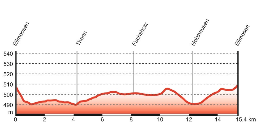 Durch Zustieg ab Bad Aibling oder ab Ellmosen startend abseits der Straße zum Kreuzweg Ellmosen-Thann (Einstieg schwierig zu finden). In Thann weiter zu den Weilern Zweckstätt und Ametsbichl, bevor es dann in die Thanner Filze geht. Im Fuchsholz am GH Filzenklas vorbei nach Schmidhausen (Querung Straße!). Auf ländlichen Nebenstraßen nach Jakobsberg und Fischbach, bevor es dann über Holzhausen und Heimatsberg wieder zurück nach Ellmosen geht.