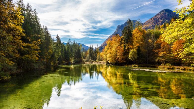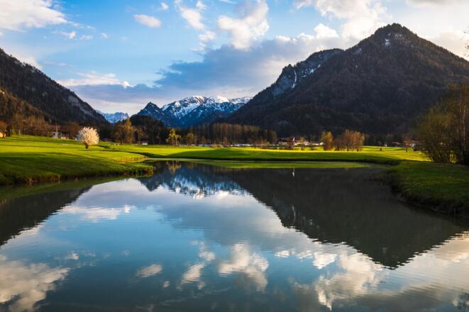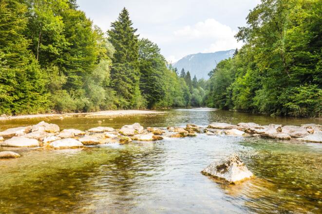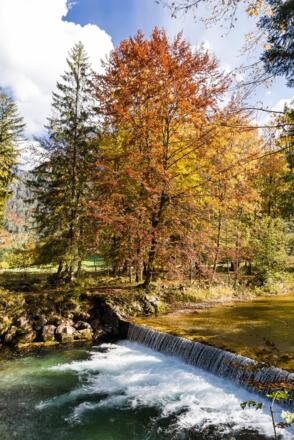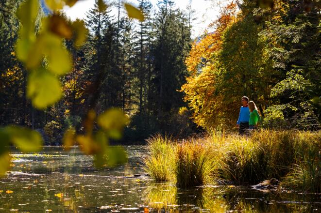 Gleichmäßig plätschert das glasklare Wasser der Weißen Traun dahin. Sie ist ein Zusammenfluss von Fischbach und Seetraun im Ruhpoldinger Ortsteil Laubau und fließt in nördlicher Richtung gen Siegsdorf. Die schattigen Auenwälder säumen die Traun bis ins Ortszentrum von Ruhpolding und spenden an warmen Tagen wohltuenden Schatten. Die Uferwege verlaufen ohne große Steigungen und sind auch für Familien mit geländegängigen Kinderwägen geeignet. Der Taubensee liegt versteckt im Wald und bietet sich optimal für eine kleine Bankerl-Pause an. Die Kneipp-Anlage in der Nähe des Ortsteiles Zell sorgt auf dem Rückweg zusätzlich für Abkühlung, hier empfiehlt sich auch ein Abstecher in die 1140 erbaute Kirche St. Valentin. Über die weitläufige 18-Loch-Golfanlage geht’s zurück, mit Blick über den ganzen Talkessel.