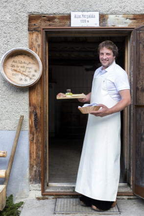 Wer nun Jahrhunderte später auf der Vergalden Alpe eintrifft, kann sich immer noch an den gleichen Alpprodukten gütlich tun das zu Zeiten von Davis Pappus möglich war. Auf der 1696 Hektar großen Alp wird nicht nur Butter und Schnittkäse produziert, sondern auch der traditionelle «Sura Kees», der aus reiner Magermilch hergestellt wird. 4000 Kilogramm dieser Montafoner Spezialität werden im Alpsommer von Senn und Beisenn hergestellt, während ein Hirte und ein Kleinhirte zu den Tieren schauen. Über 50 Milchkühe sind im Sommer auf der Vergalden Alpe und etwa dreimal so viel Jungvieh. Und immer nahe bei der Alphütte anzutreffen ist auch ein gutes Dutzend Alpschweine.