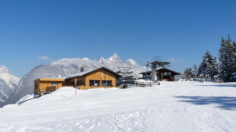 Von der Sonnenterrasse der traditionsreichen Holzhütte erstreckt sich ein eindrucksvolles Bergpanorama über das weitläufige Leutaschtal, das man bei hausgemachten Köstlichkeiten, frischgezapften Erfrischungen und dampfenden Heißgetränken hier einfach auf sich wirken lassen kann. Wer sich lieber drinnen aufwärmt, findet dort eine gemütliche Tiroler Stube mit Kachelofen und knisterndem Kaminfeuer. Und wer am Rückweg noch etwas wohltuende Entspannung sucht, findet in der ErlebnisWelt Alpenbad Leutasch vielfältige Wellnessangebote vom Alpenkräuteraufguss bis zur Wadenmassage.