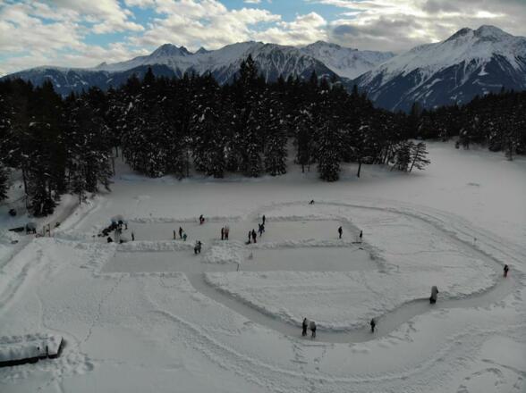 Nach einem kurzen Steigungsstück trifft der Wanderweg auf eine breite Schotterstraße und zweigt dann wenig weiter nach links zur Möserer Seestub’n ab. Die gemütliche Sonnenterrasse hier aber vorerst umgehen und in beliebiger Laufrichtung eine winterlich verschneite Seerunde genießen. Auf halber Höhe rückt sich die Möserer Seestubn’n dann eindrucksvoll ins funkelnde Bergpanorama und posiert auch gern für ein verträumtes Erinnerungsfoto.