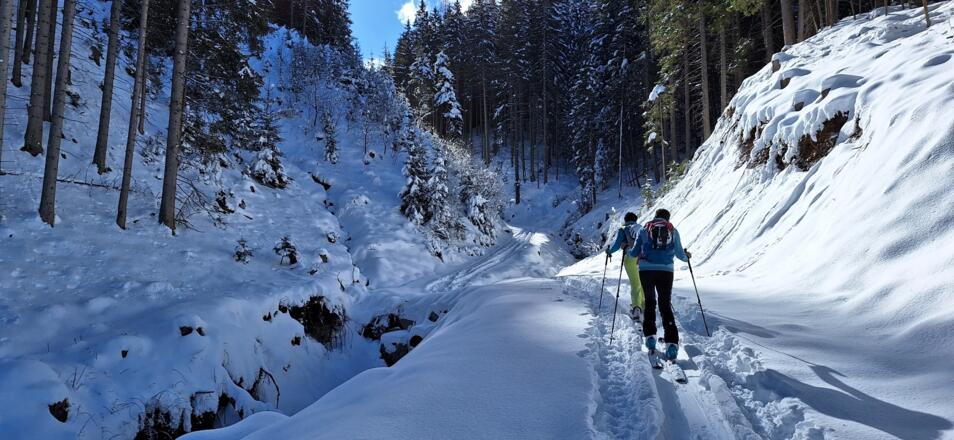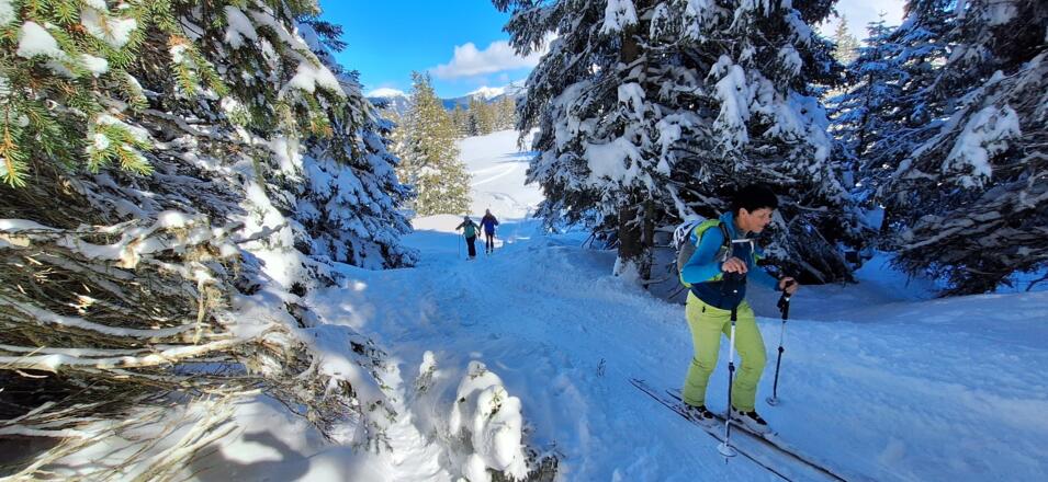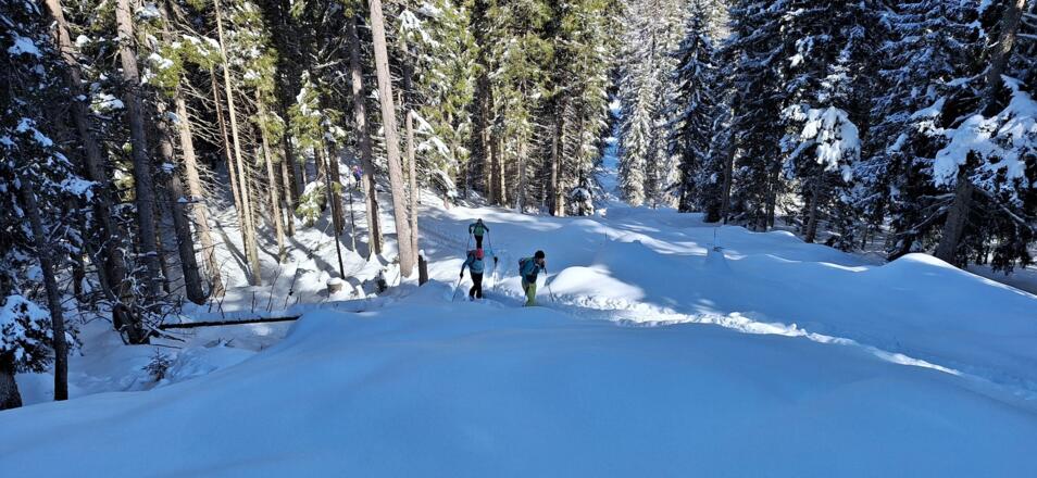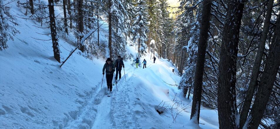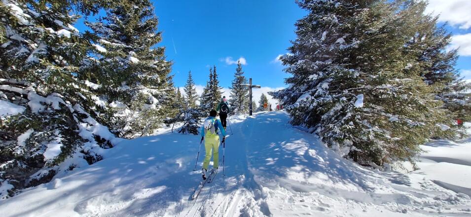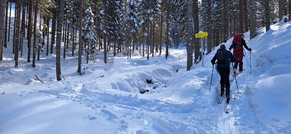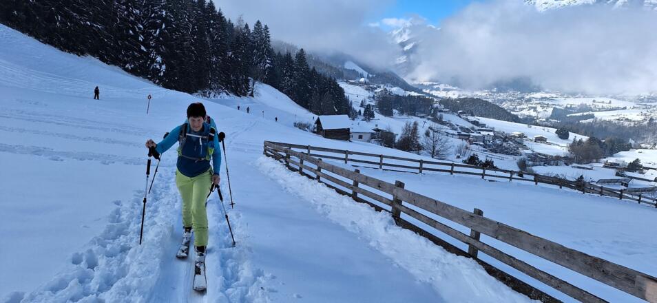 Diese einfache Skitour, die meist durch den Wald führt ist ideal an lawinengefährlichen Tagen. Die Abfahrt führt auf der Piste des Skigebiets Serleslifte-Mieders ins Tal.