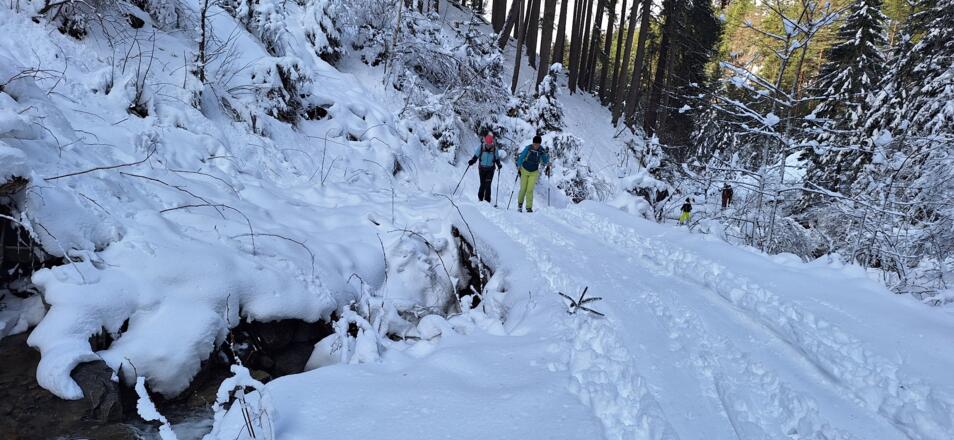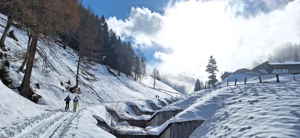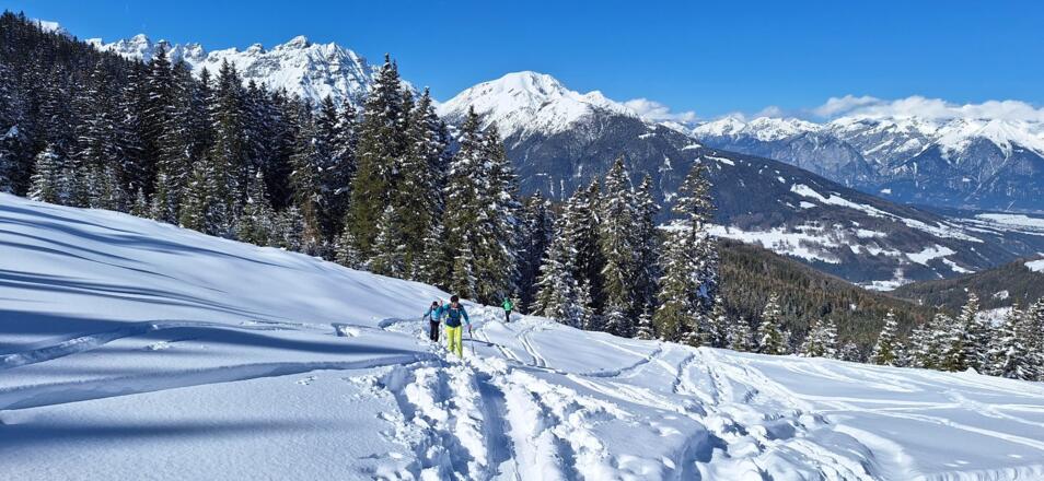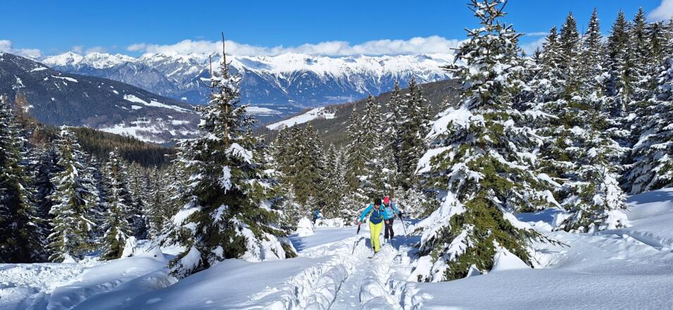 Bei ausreichender Schneelage im ersten Teil reizvoller Anstieg entlang des Zirkenbachs und nach dem Durchqueren des Waldes überraschend schöne Aussicht auf Serles und die Kalkkögel.