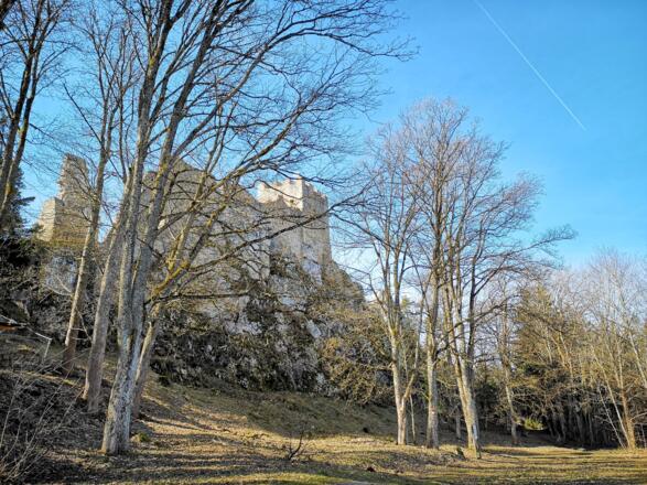 In Großseiboldsried angekommen wird der Ort durchquert und nach der Ortschaft der zweite Waldweg zur linken Seite genommen, der eckigen 7 und der roten Nummer 3 (später blaue 8) folgend. Mit leichtem Anstieg geht es nun zurück in Richtung Weißenstein und der Burgruine. Wer nach der Wanderung rasten mag, kann die Tour auf der Plattform unterhalb des Turms ausklingen lassen oder den Gläsernen Wald neben der Burg besuchen.