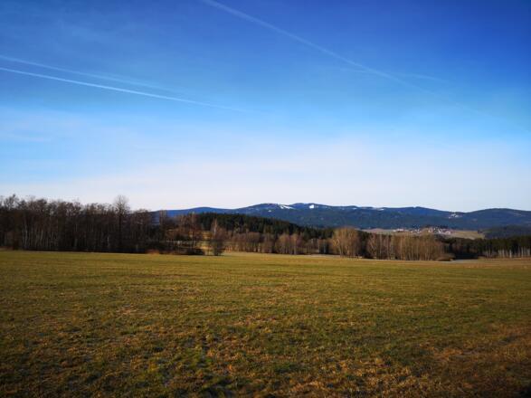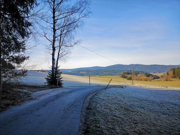Weiter geht die Wanderung durch den kieferndominierten Wald rechts des Quarzriffes nunmehr dem Wanderweg 3 folgend. Wir erreichen die Asphaltstraße in Richtung Kattersdorf. Hier bietet sich ein herrlicher Ausblick in Richtung Regen. In Kattersdorf angekommen, muss links die Abzweigung in Richtung Großseiboldsried, immer noch der roten 3 folgend genommen werden. Malerisch schmiegt sich der Weg in die Landschaft, abwechselnd an Wald und Feld vorbei, immer mit tollen Fernblick.  Kurz vor Großseiboldsried geht es nochmal in den Wald hinein. Hört man genau hin, kann man den Specht vernehmen wie er auf Nahrungssuche die Bäume abklopf. Die ganze Natur scheint aufzuwachen und sich auf den Frühling vorzubereiten. Kleine Tannenmeisen flitzen aufgeregt zwitschernd von Ast zu Ast.