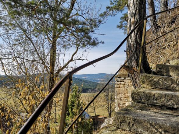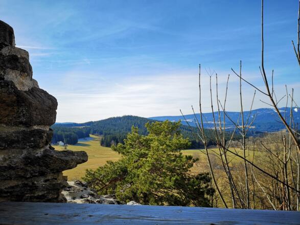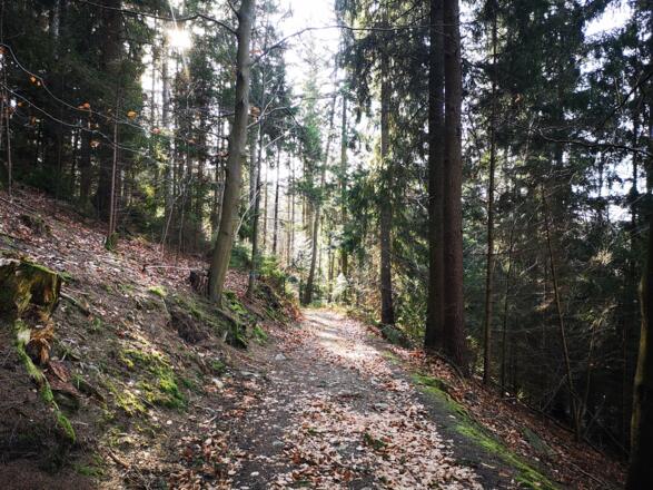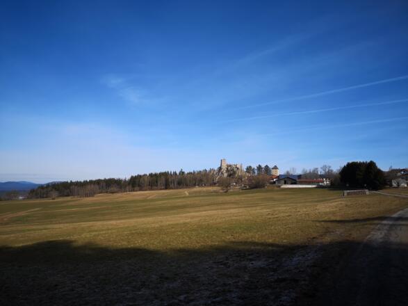 Diese Woche geht es auf aussichtsreiche Wege Rund um Weißenstein. Der Startpunkt unserer 7,5 km langen leichten Tour befindet sich am Parkplatz unterhalb der Burgruine Weißenstein. Von hier aus folgen wir dem roten Schwert des Pandurensteig zwischen Kapelle und Burg. Majestätisch erhebt sich links neben uns die Burgruine Weißenstein. Sie wurde um 1100 auf einem auf einem 758 Meter hohen Quarzfelsen, dem Pfahl erbaut. Wie so oft, ranken sich Geschichten um solche Orte. Einer Sage nach wollte die Frau eines Ritters ihre neugeborenen Siebenlinge ertränken lassen. Der vom Krieg heimkehrende Ritter verhinderte dies und ließ die Jungen heimlich im Kloster Rinchnach aufziehen. Nach Jahren kehrten die Siebenlinge als erwachsene Männer zurück auf die Burg. Der Burgherr fragte seine Frau, was mit einem Menschen geschehen solle, der solchen Söhnen den Tod wünscht. Sie entgegnete ihm: Man solle die Person lebendig einmauern. Daraufhin wurde sie eingemauert. Noch heute geistert dort eine weiße Gestalt durch die Räume, welche nach Erlösung sucht. Da wir aber nicht auf Geisterjagd sind, setzen wir unsere Tour fort.